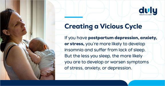 If you have postpartum depression, anxiety, or stress, you’re more likely to develop insomnia and suffer from lack of sleep. But the less you sleep, the more likely you are to develop or worsen symptoms of stress, anxiety, or depression.
