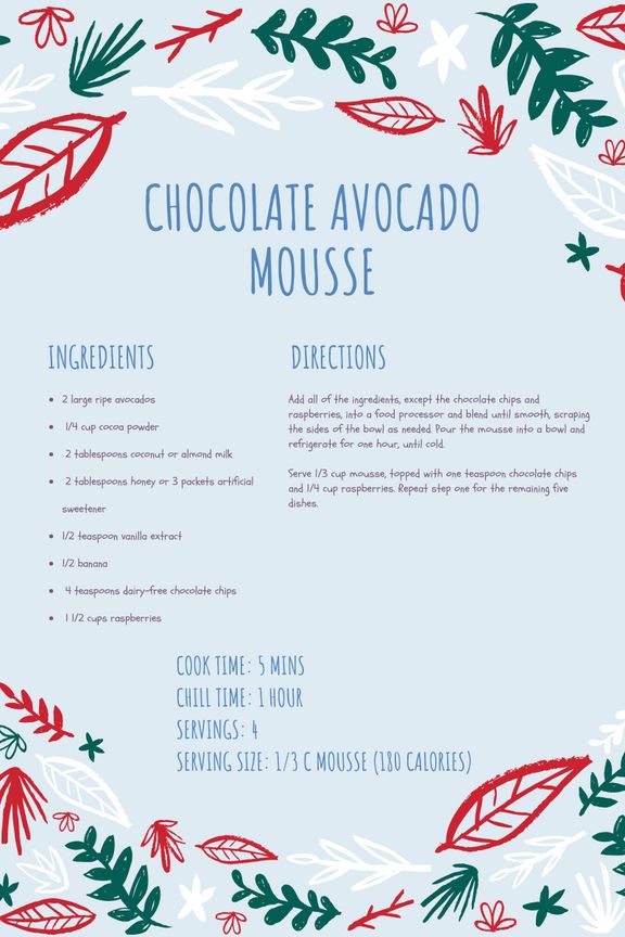 Everyone loves dessert and making sweet treats from natural foods is great. You will be surprised how creamy this mousse is from the avocado, and it’s a nice dessert to serve a guest who has a dairy allergy.