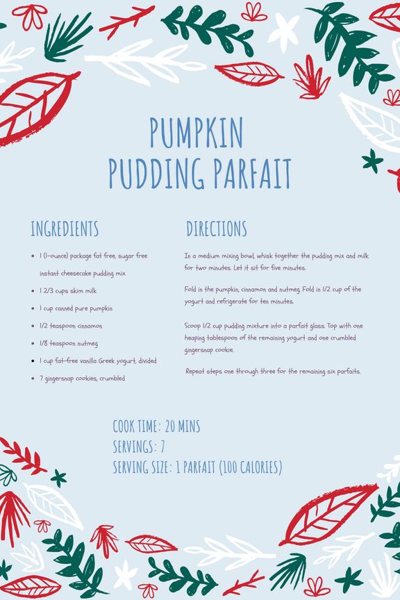 This no-cook dessert is a great substitute for pumpkin pie — and it’s only 100 calories! For a quick, healthy and delicious pumpkin dessert, look no further — this pudding parfait is amazing and ready in minutes. You can substitute light whipped cream for the Greek yogurt here if desired.