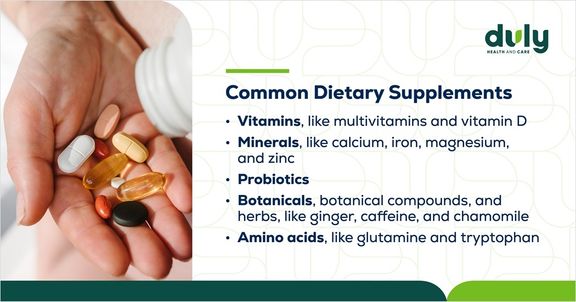 Dietary supplements are products that you add to your diet in addition to conventional food. They’re consumed via ingestion and come in many shapes and sizes, like pills, powders, liquids, bars, skin patches, and gummies.