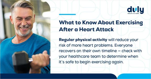 Before engaging in any exercise after a heart attack, get clearance from your healthcare team that it’s safe to do so. As you begin your exercise journey, always listen to your body — and remember that it could take months to get into a routine that works for you.