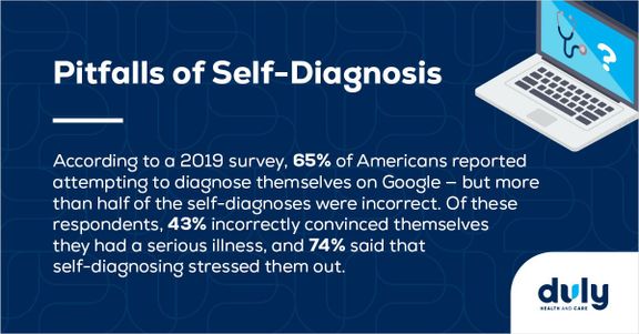 According to a 2019 survey, 65% of Americans reported attempting to diagnose themselves on Google — but more than half of the self-diagnoses were incorrect. Of these respondents, 43% incorrectly convinced themselves they had a serious illness, and 74% said that self-diagnosing stressed them out.