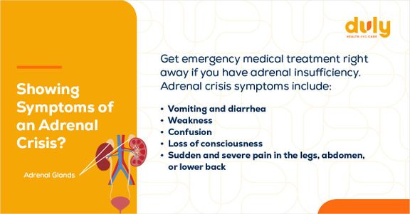 Get emergency medical treatment right away if you have adrenal insufficiency. Adrenal crisis symptoms include: