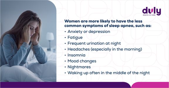 OSA is underdiagnosed in both men and women, but more so in women. One of the main reasons is that women’s symptoms aren’t always as obvious. Some symptoms are the same across the board, such as the telltale loud snoring, visibly not breathing at certain points during sleep, daytime tiredness, and snorting, gasping, or choking while sleeping. But there are some symptoms that are less common in men.