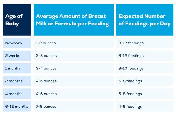 Every baby is different. How much and how often they feed will vary — and that’s okay. As your baby grows, their feeding needs will naturally change. While there’s no one-size-fits-all approach, the chart below offers general guidance for feeding in the first year: